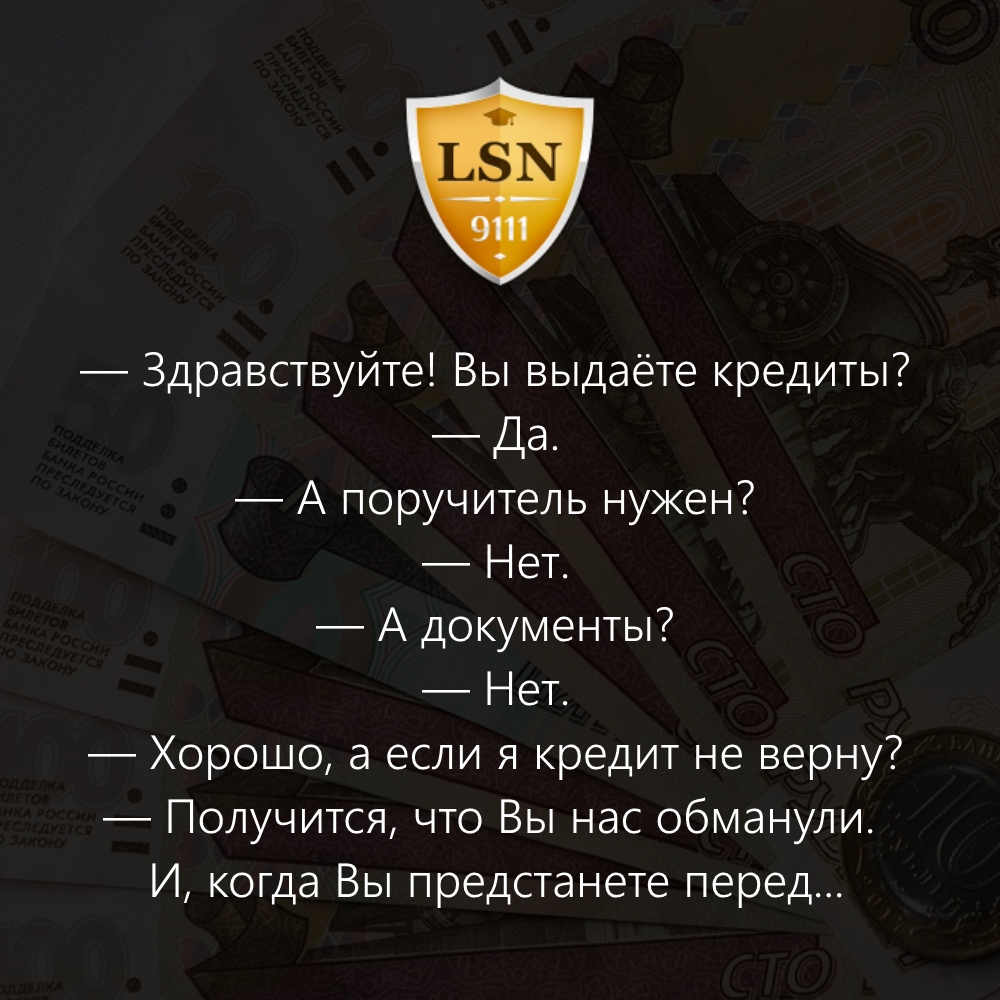 Всё из жизни : если у Вас одна проблема, то возьмите КРЕДИТ! И БУДЕТ ВАМ СЧАСТЬЕ И НА ОДНУ ПРОБЛЕМУ БОЛЬШЕ! . .