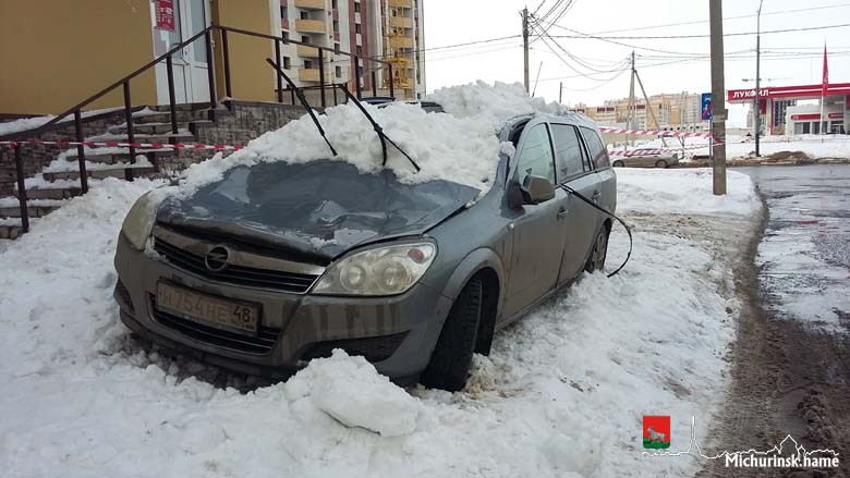 Упал снег с крыши дома на машину