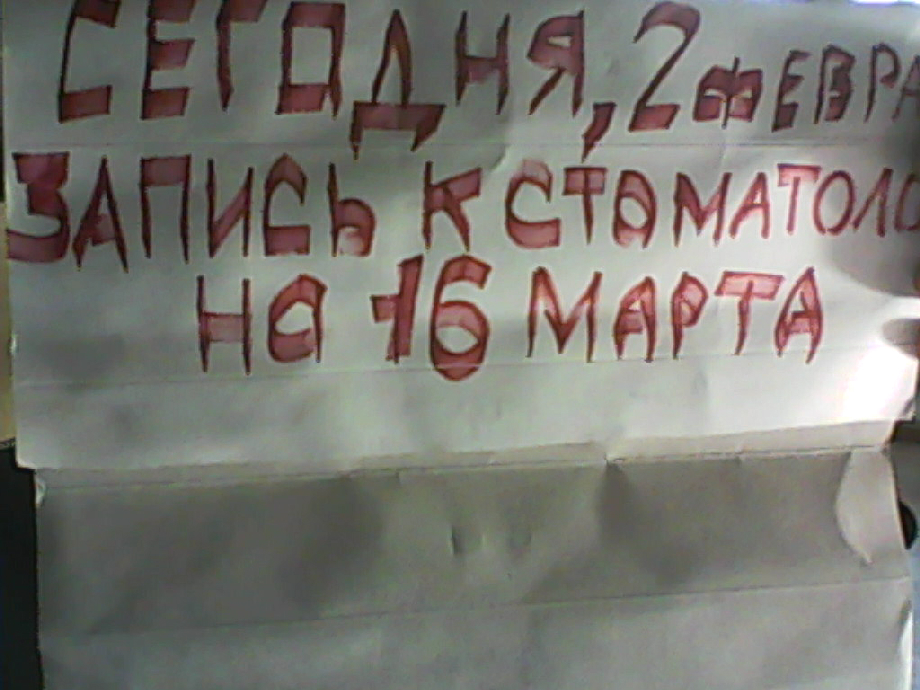 Сегодня, в пятницу 2 февраля, утром пришел в ЦРБ записываться на лечение к стоматологу. Очереди нет, радостно. Радость угасла, когда выяснилось, что записали только на...16 марта. Что ж так? Оказывается, из 6 врачей - стоматологов по штату в наличии только два. Некомплект, мол. Два на весь район в несколько десятков тысяч жителей.