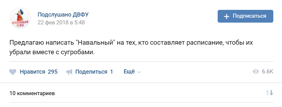 «5109 ак, вы в моем чёрном списке навсегда. Про хорошее расписание забудьте! Навальный вам его составит» — написала «ВКонтакте» Юлия Григорьева, доцент кафедры лингвистики и межкультурной коммуникации ДВФУ.