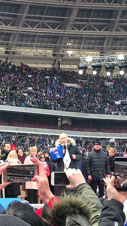 В середине концертной программы на сцене под гром аплодисментов вышел кандидат в президенты России Владимир Владимирович Путин. Стадион «Лужники» вместе с ним исполнил гимн Российской Федерации, наш гимн который сборная России по хоккею исполнила без музыкального сопровождения на олимпиаде в Пхеньяне. Владимир Владимирович Путин это наш президент и выбор 18 марта 2018 года очевиден.#СильныйПрезидент #СильнаяСтрана #Путин 2018 #Лужники #3 марта.