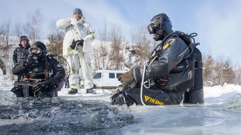 Боевые пловцы совершили водолазные спуски в пропиленную специальным инструментом полынью, отработали вопросы ориентирования под водой, порядок выхода из нее на полуоткрытую и открытую местность. Потом бойцы провели учение по нейтрализации условного противника на поверхности.