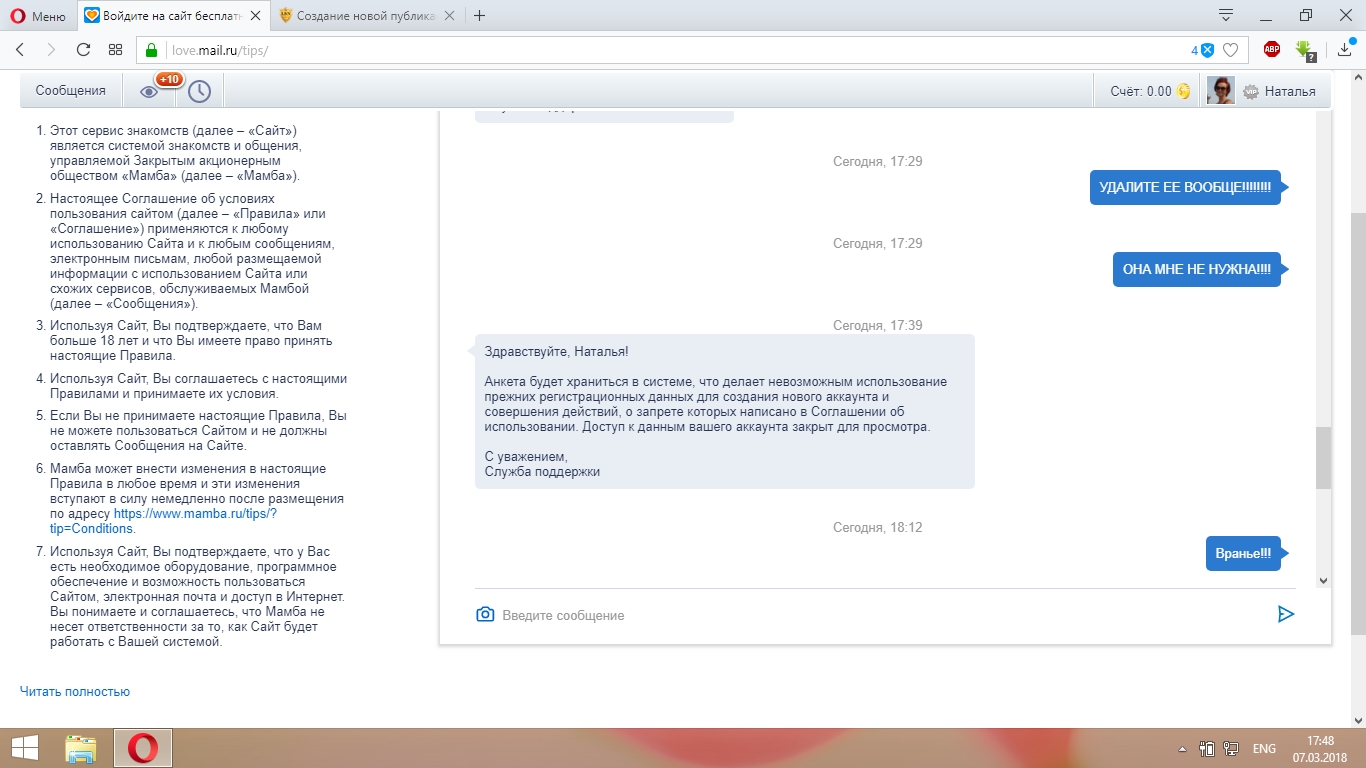 Знакомства майл ру. С виду, довольно привлекательный сайт (пусть со своими небольшими багами). Сделала, значит, я рассылку с приглашением в клуб в таком-то месте в такое-то время. Через 15 минут меня заблокировали. Я спросила, почему, ведь это не был спам, я их пригласила - они согласились. Админы строчат: вы совершили неправомерный акт в отношении сайта, вы спамер, и мы вас заблокировали. Диалог получился односторонний, т.к. на каждое мое сообщение они строчили одно и то же. Я спросила, как мне быть с моими друзьями, которые ждут моего сообщения. Опять тот же ответ: вы спамер, бла-бла-бла. Я пишу: в таком случае я требую удалить мою анкету с сайта. На что они мне ответили, вы не поверите (хотя я вижу свой профиль со своими фото в онлайне, вижу новые просмотры и сообщения, а доступа к профилю у меня нет): МЫ НЕ УДАЛИМ ВАШУ АНКЕТУ, НО И ДОСТУП К НЕЙ НЕ ДАДИМ. Что это получается, они решили воспользоваться моими персональными данными? Использовать мои фото в своих целях? Я написала в службу поддержки самого сайта МАЙЛ РУ, с надеждой, что ответ-таки мне дадут вышестоящие... Но в письме я русским языком указала на то, что их неправомерные действия в адрес моих персональных данных может повлечь не смешные последствия, то бишь, статья есть, а там и иск можно подать... Что вы думаете по этому поводу?