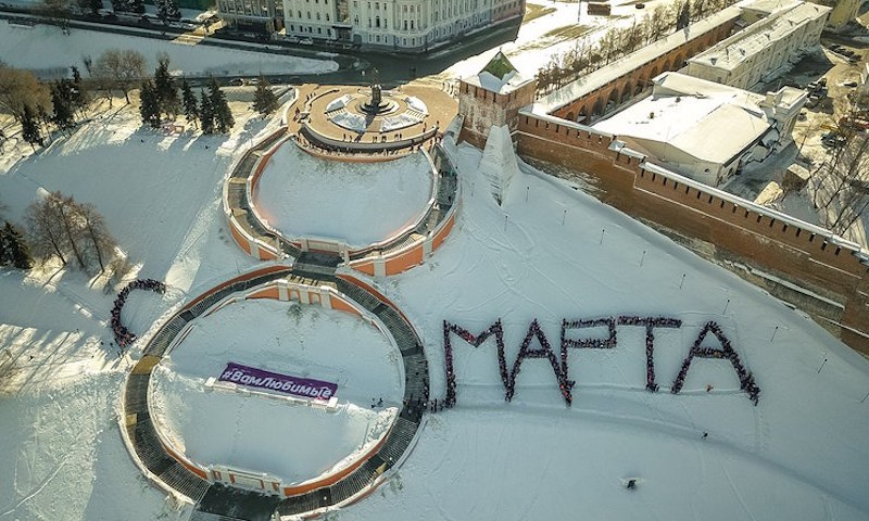 Рекорд России установили нижегородские мужчины. Они составили самую большую надпись «С 8 Марта». Участники поздравительной акции выстроились на Чкаловской лестнице, которая как раз имеет форму восьмерки. Всего в слова «С» и "МАРТА» сложились 728 человек, в том числе губернатор Нижегородской области Глеб Никитин. Представитель Книги рекордов России Леонид Сенаторов зафиксировал этот рекорд.«Флешмобы с участием большого количества людей регистрировались в различных конфигурациях, например, кольца. Но подобный рекорд с участием только мужчин и надписью »С 8 Марта« регистрируется впервые. Это интересная и необычная идея. Мы зарегистрировали 728 человек, рекорд зафиксирован и внесен в официальный сертификат», —заявил он.Глава Нижегородской области отметил, что Чкаловская лестница – самая большая в стране среди лестниц такого типа.