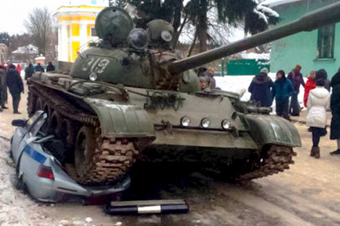 Нарофоминские спасатели получили сообщение, что на одной из улиц полицейскую машину военный танк раздавил буквально в лепёшку. Позднее выяснилось, что танк наехал на автомобиль намеренно — в Наро-Фоминске снимается остросюжетная лента. Далее: Подробнее ➤