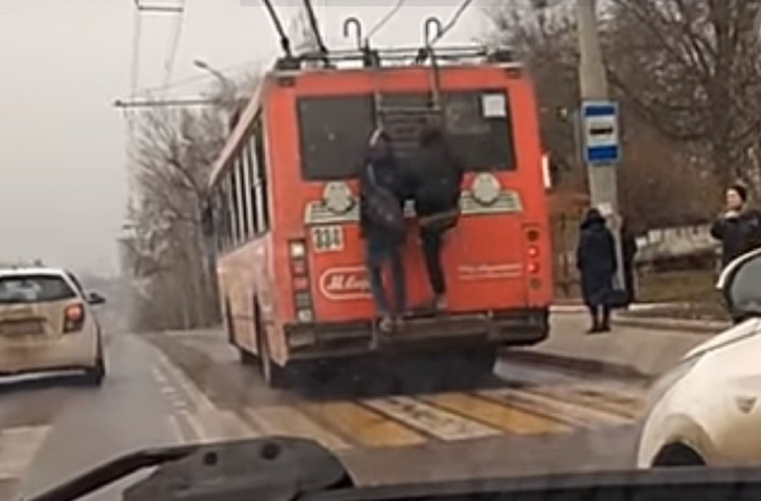 В Интернете разместили видеоролик, в котором показано, как двое человек зацепились за троллейбус. Далее транспорт начал двигаться.