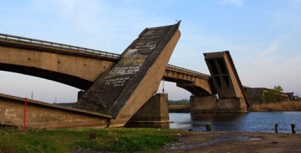 Я живу в двух километрах от этого места! В моём детстве каждый "уважающий себя пацан" в 10-11 лет должен был нырять с "быка" (надводная часть опоры моста) высота 4-4.5 м В 12-14 лет с "берлика" (сам мост) высота с проежей части около 18 метров Ну а некоторые прыгали и с "поднятого" (взорванная часть моста) с него я не прыгал не разу высота примерно 25-26 метров страшновато! Не мало ребят разбилось!