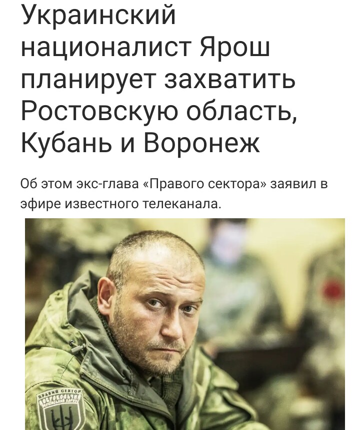 «Главное — вернуть территории, а потом мы подумаем, будет уже другое время, там молодежь — у нас Кубань, Донщина, Воронеж», — отметил он. Под «Донщиной» Ярош имел в виду Ростовскую область.