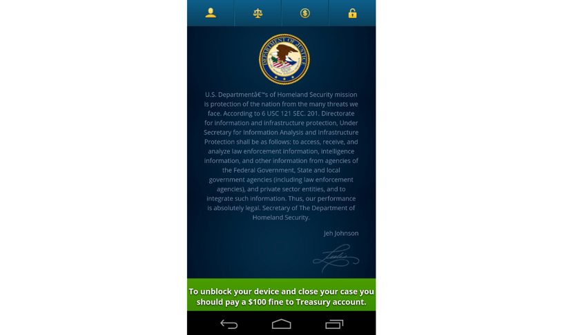 Вымогатели работают по одному принципу: перекрывают рабочий экран большим окном, которое должно запугать пользователя и не давать доступ к остальным функциям. Такой вирус может показывать объявление якобы от полиции с угрозами оплатить штраф за скачивание нелицензионного контента или детского порно, даже если пользователь этого не делал. Еще некоторые вирусы шифруют файлы и требуют деньги за доступ к ним, но такие типы угроз не стали популярными.