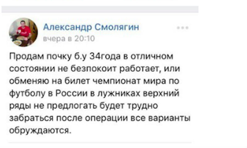 Житель Тюмени ради того, чтобы посетить чемпионат мира по футболу, готов продать свою почку. 34-летний мужчина даже пытался разместить объявление о продаже органа в тюменских группах в соцсетях. Администраторы группы Вконтакте не решились разместить это объявление, опубликовали только скриншот. Как сообщил футбольный фанат, орган, который он продает, в отличном состоянии. Как принято говорить в таких случаях торг и обмен уместны, поскольку мужчина готов обменять почку на билеты на игру чемпионата мира по футболу в московском стадионе «Лужники». Однако сразу же предупредил, что верхние ряды не предлагать, только поближе к полю, «так как на верхние ряды будет забраться проблематично после операции».Пользователи подумали, что это шутка и назвали ее неудачной. Хотя были и те, кто поверил фанату. «Судя по ошибкам, может, и не шутка. Единственный способ заработать на билет с таким интеллектом», — написали комментаторы.