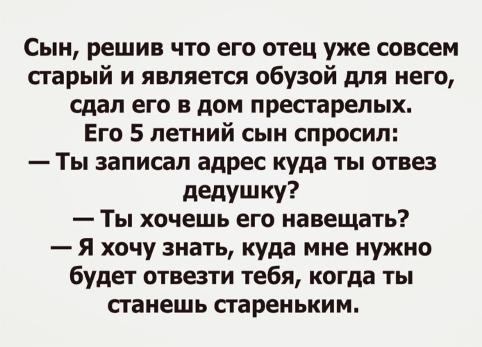 Пример для подражания. Уважайте своих страрых родителей, тогда и Ваши дети будут уважать Вас.