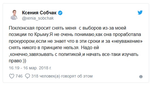 Напомним, ранее Поклонская потребовала от Центральной избирательной комиссии (ЦИК) снять Собчак с выборов главы государства. По словам бывшего крымского прокурора, светская львица нарушила закон и посягнула на территориальную целостность России своими заявлениями о статусе полуострова. Телеведущая ранее неоднократно заявляла, что считает Крым украинским и не признает его воссоединение с Россией.