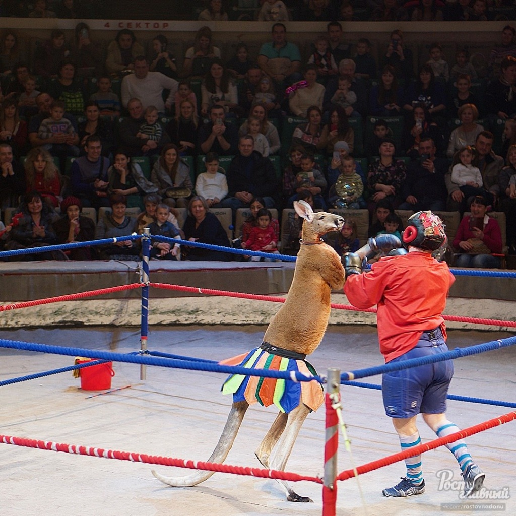 Фотографии такого необычного спортивного состязания выложили ростовчане в социальной сети. Автор снимков написал о разборках в ростовском цирке и о том, что кенгуру всем навалял.