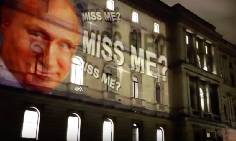 Проекция с лицом победившего на президентских выборах Владимира Путина появилась на здании Форин-офиса (МИД Великобритании) в Лондоне. Портрет российского лидера сопровождался надписями Miss me? (Скучали по мне?). Автором инсталляции стала группировка Philosoraptor. Разместить Путина на здании МИД они решили, чтобы напомнить о легитимном статусе главы государства, которого поддерживает большинство россиян.«Очень удобно, что на Западе во всем виноваты русские и Путин. Путин вмешивается в выборы в Америке, Путин отравил Скрипаля, Путин обрушил курс биткоина. Русские любят своего сильного лидера и вновь избрали его президентом. Давайте уважать выбор русского народа» , - говорится в описании к опубликованному в Сети видео.
