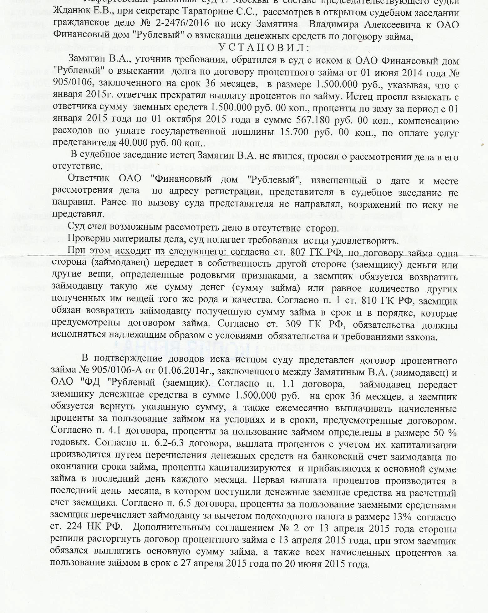 Расскажу свою историю. Дело в том что я простой человек, всю жизнь работал. И в шахте работал и на Чукотке работал и на Севере Тюмени. Заработал полтора миллиона рублей и решил их вложить под проценты. Заключил договор процентного займа с ОАО «Финансовый дом Рублёвый» Договор процентного займа № 905/0106-А г. Москва от первого июня две тысячи четырнадцатого года (копия прилагается). До конца года проценты выплачивали регулярно, а с Нового 2015 года прекратили выплачивать, Исп.Воронов Сергей Михайлович.