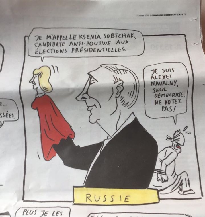 За несколько дней до выборов президента РФ французский сатирический еженедельник Charlie Hebdo опубликовал карикатуру на главное политическое событие в России. Фотографию страницы журнала в своем аккаунте в Facebook**** опубликовал галерист и экс-директор музея современного искусства PERMM Марат Гельман.