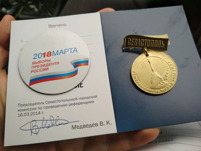 В Крыму дарили значки с символикой и датой выборов. Конкретно в Севастополе вот такой памятный подарочек.