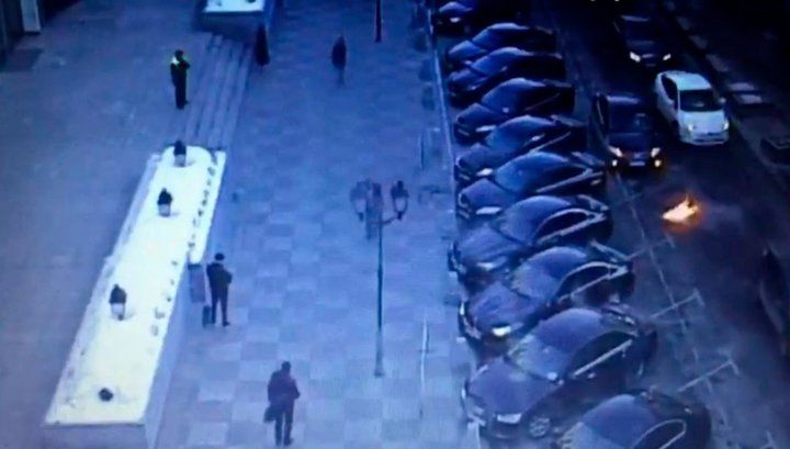 Во вторник вечером к зданию на Большой Дмитровке подошел мужчина, в сумке которого, как видно на кадрах, было по меньшей мере три "коктейля Молотова". Первая бутылка с зажигательной смесью перелетела дорогостоящие иномарки и разбилась на проезжей части.