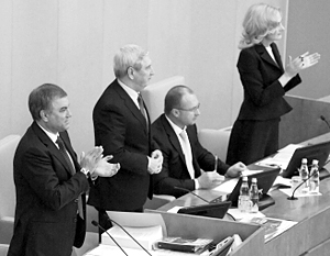 Пока спикер Госдумы, первые вице-спикеры, вице-спикеры и депутаты аплодировали стоя, Лебедев сидел на своем месте и не аплодировал.