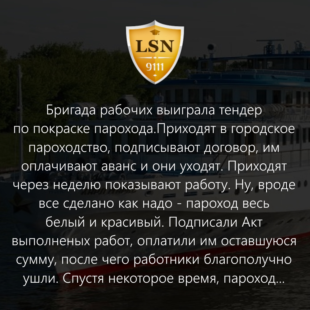 Приходят в городское пароходство, подписывают договор, им оплачивают аванс и они уходят. Приходят через неделю показывают работу. Ну, вроде все сделано как надо - пароход весь белый и красивый. Подписали Акт выполненых работ, оплатили им оставшуюся сумму, после чего работники благополучно ушли. Спустя некоторое время, пароход отчаливает, разворачивается другим боком, а там – вся сторона ржавая, черная и без единого белого пятна.