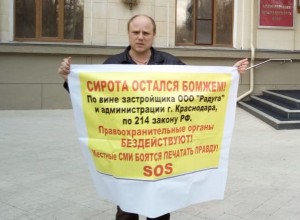 Он, понимая происходящее, просто вынужден был обратиться в типографию, в которой ему изготовили плакаты. С ними он проводит одиночные пикеты не только у администраций, но и прокуратуры и других ведомств. В планах у сироты пикетирование здания полпреда ЮФО и генеральной прокуратуры. Цель мероприятий одна - вернуть себе законом положенное ему жилье и перестать быть не только сиротой, но, хотя бы, бездомным.