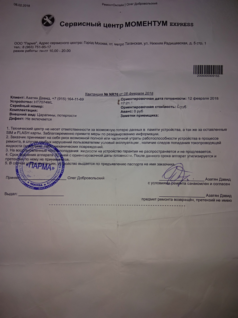 Но очень скоро, (на следующее утро) мне опять позвонили и сказали, что планшет отремонтирован и я должен оплатить за ремонт и забрать его. И добавили, что я это должен сделать как можно скорее, потому что на днях они должны переезжать в другой офис.