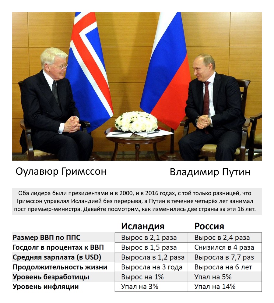 На картинке к посту вы видите краткое сравнение России и Исландии. За 16 лет с 2000 по 2016 год наши страны проделали значительный путь, однако вот так сходу заявлять, что Оулавюр Гримссон добился меньших успехов, чем Владимир Путин, было бы неправильно.