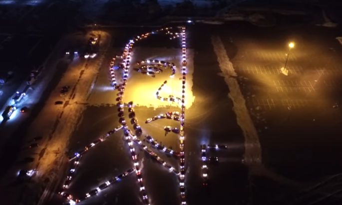Хабаровские водители выстроили из машин портрет Путина. «Рисовали» всё по бумажке, по рулетке, по веревочке не один час. Всего около 300 авто. Говорят, было бы больше — полностью нарисовали бы.