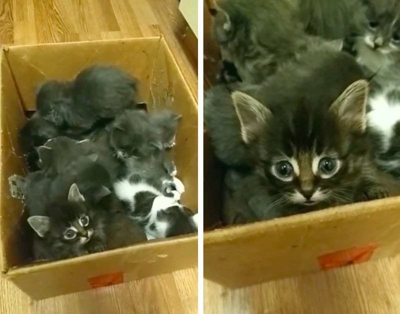 1 марта поздно вечером в городе Саскатун (Канада) мужчина, который возился в гараже со своей машиной, вдруг случайно услышал тихий писк из ближайшего переулка. Было очень холодно, поэтому мужчина решил сразу же пойти проверить, что там такое. Он был очень удивлен, обнаружив небольшую картонную коробку, в которой тесно прижавшись к друг дружке сидело восемь маленьких котят. Мужчина сразу же занес котят в свой дом, а потом начал искать телефоны служб помощи животным. Он нашел номер общества SCAT - Street Cat Rescue и позвонил им. В обществе сразу согласились принять котят к себе."Стоял сильный мороз минус 20 по Цельсию и дул сильный холодный ветер. Котята пострадали от холода, у них было переохлаждение и нужно было экстренно их согреть. Для маленьких котят такое положение очень опасно, они могли умереть на холоде всего за несколько часов",-рассказал один из волонтеров приюта.