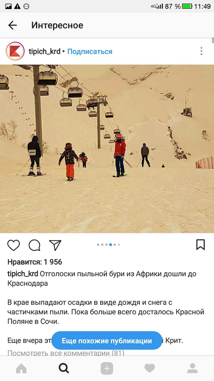 -Желтоватый оттенок снега связан с повышенным содержанием пыли, которая была занесена ветром из пустынных районов Африки. Под атмосферной пылью в данном случае понимаются минеральные частицы размером меньше 10-15 микрон. Они могут переноситься воздушными массами на большие расстояния: на сотни и тысячи километров. Основным источником пыли в мире являются пустыни, в частности, Сахара. - заявил интернет-изданию N+1 лабораторией гляциологии Института географии РАН Станислав Кутузов.