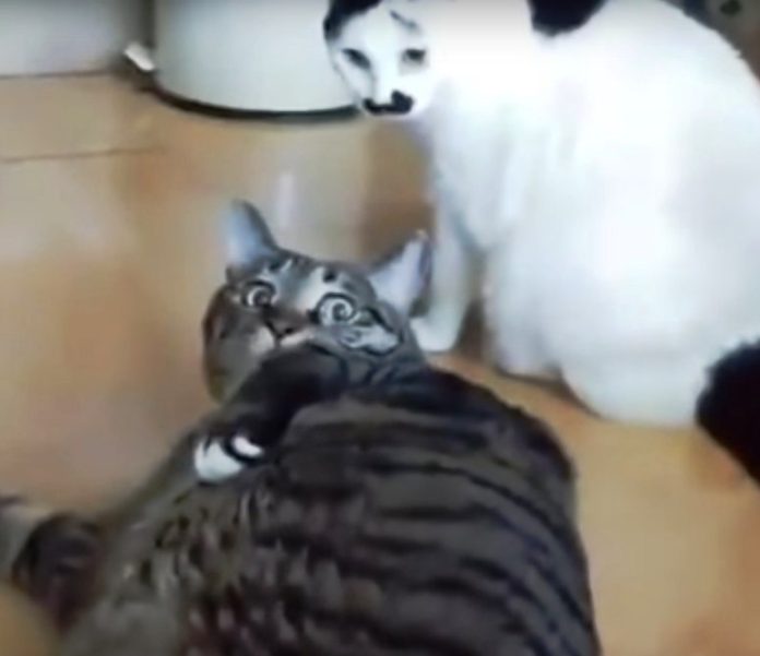 В Сети набирает популярность ролик, на котором толстый кот весьма оригинальным способом остановил схватку между двумя другими питомцами.