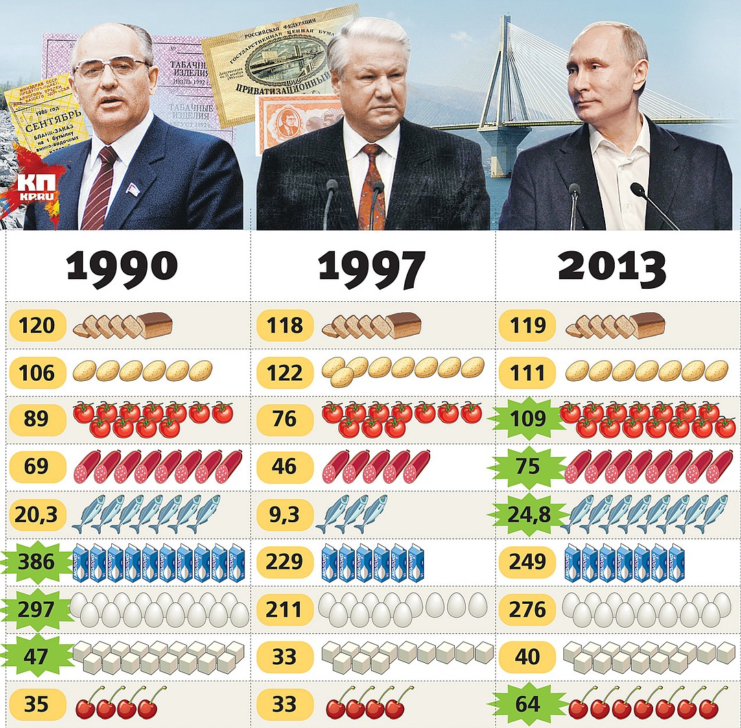 Если еще 30 лет назад свежие овощи зимой были невиданной роскошью, а сегодня это вполне обыденно. Разумеется, доступность обусловлена не столь мудростью правительства, сколько естественным техническим прогрессом - снижением себестоимости производства и логистики. Но это не отменяет того факта, что при нынешней власти жизнь оказалась лучше, чем за все предыдущее время.