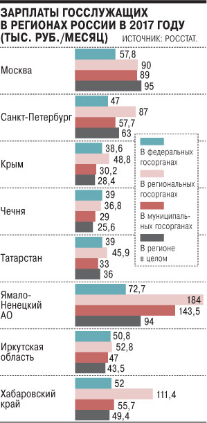 Самые высокие зарплаты среди госслужащих органов исполнительной власти субъектов РФ зафиксированы в Ямало-Ненецком АО (184 тыс. руб.), на Чукотке (127 тыс.), в Хабаровском крае (111 тыс.). Самые низкие — в Ингушетии (25,5 тыс. руб.), Карачаево-Черкесии (28 тыс.) и Северной Осетии (28,3 тыс.). Среди территориальных органов федеральных ведомств самые высокие зарплаты были в МИДе (87 тыс. руб.), Росфинмониторинге (74,5 тыс.) и Росгидромете (54,8 тыс.).