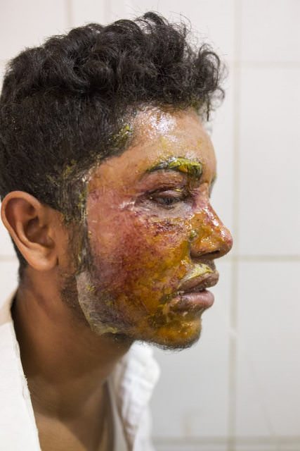 На фотографиях Махмудул лежит на больничной койке в Бангладеш, не представляя, как ему жить дальше. Кожа на его лице покрыта красными ожогами и отходит слоями. Также он получил серьёзные ожоги правого плеча. Пока врачи не могут сказать, сможет ли пострадавший когда-нибудь полностью восстановиться.