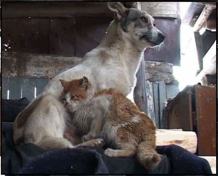 Собака с кошкой три года выживали в заброшенном коровнике
