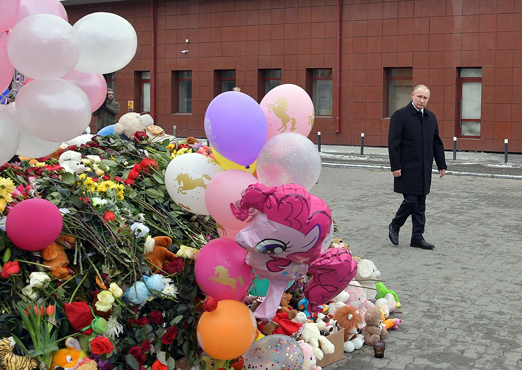 Сегодня утром в Кемерово прилетел Владимир Путин. Он возложил цветы к стихийному мемориалу у здания ТЦ, посетил пострадавших и провел совещание, посвященное ликвидации последствий пожара.