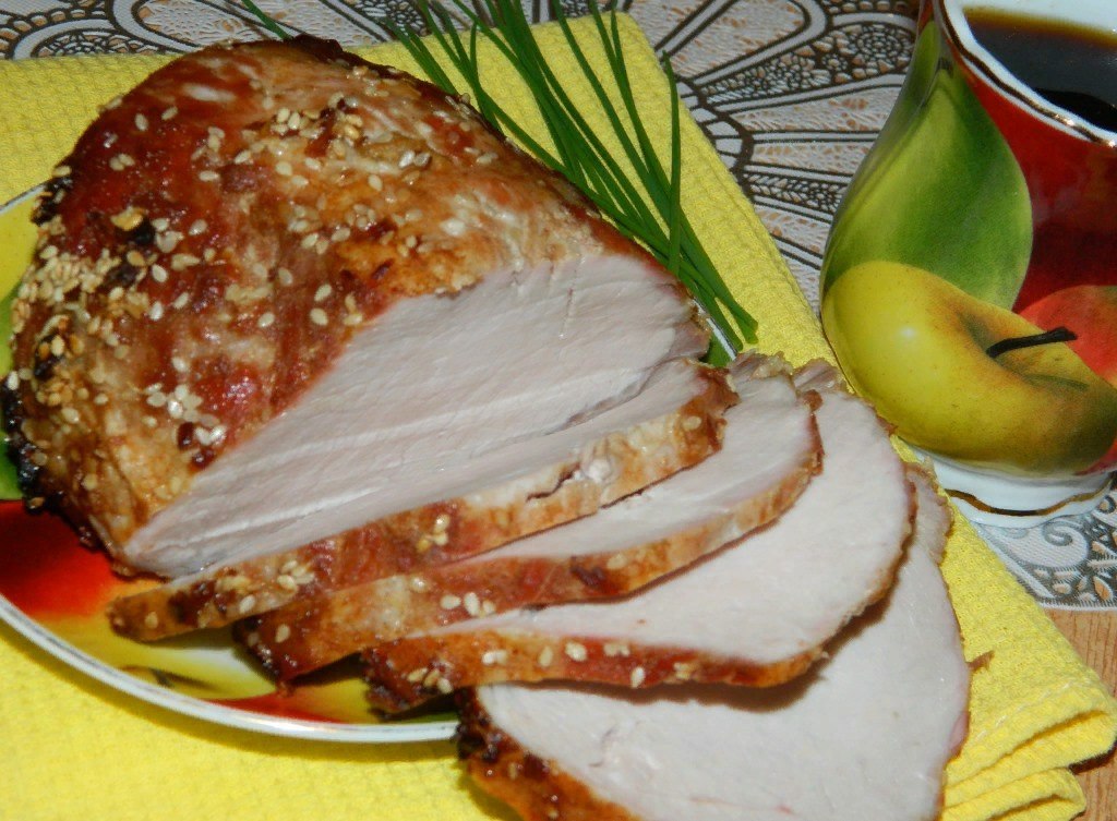 Пока мясо запекается, довести до кипения оставшийся маринад и проварить минут 5. Процедить. Можно подавать вместе с мясом.