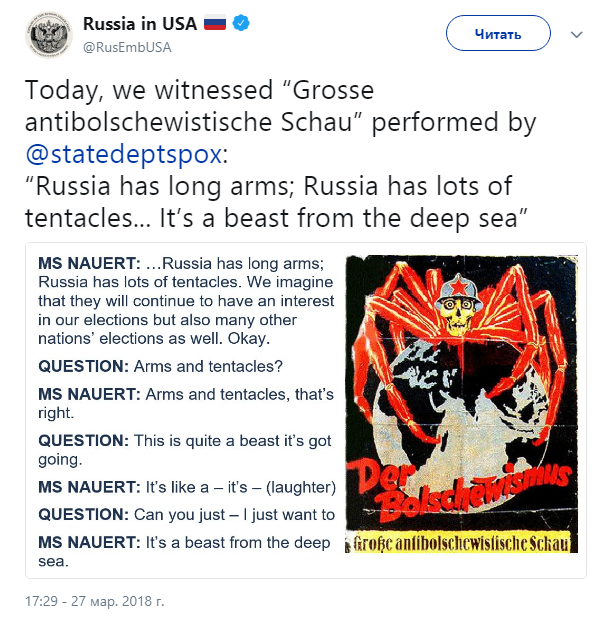В российском посольстве в США с иронией отнеслись к выступлению представителя Госдепа. В твиттере дипмиссии появилась запись с изображением агитационного плаката времен нацистской Германии. На нем паук в красноармейской буденовке сидит на земном шаре, опутав тот лапами. «Сегодня мы стали свидетелями великого антибольшевистского шоу в исполнении представителя Госдепа», — подписали твит в посольстве.