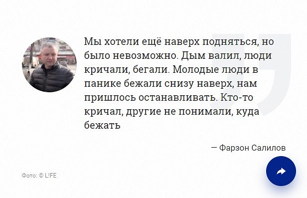 — Мы увидели, как люди бегают по второму этажу, паника. Тоже решили выйти из торговой точки. Когда увидели, что толпа собирается, открыли запасной выход через наш отдел. Когда увидели, что дымом всё занесло, вышли и сами, — вспоминает Салилов.