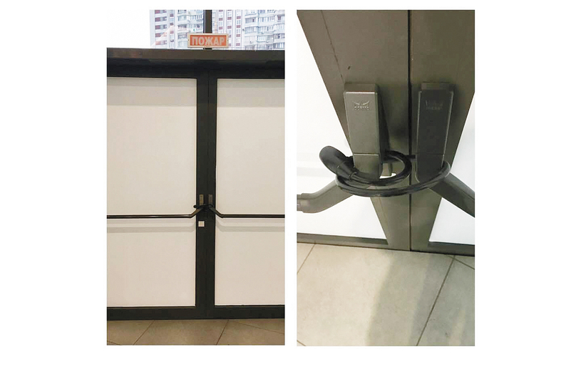 Наконец, новенький ТРЦ на северо-западе столицы. Сюда бдительные жители, подавленные трагедией в Кемерово, пришли практически сразу. И обнаружили прекрасное: противопожарные выходы, тщательно закрытые... велосипедными замками. Вот это, товарищи, самое страшное и есть: если в предыдущих случаях есть надежда, что при нажатии «красной кнопки» все откроется как по мановению волшебной палочки, то здесь не откроется ничего. Пока не прибежит охранник с ключом. А он — помним о законах Мерфи — не прибежит. Так что здесь придется делать оргвыводы самые радикальные.
