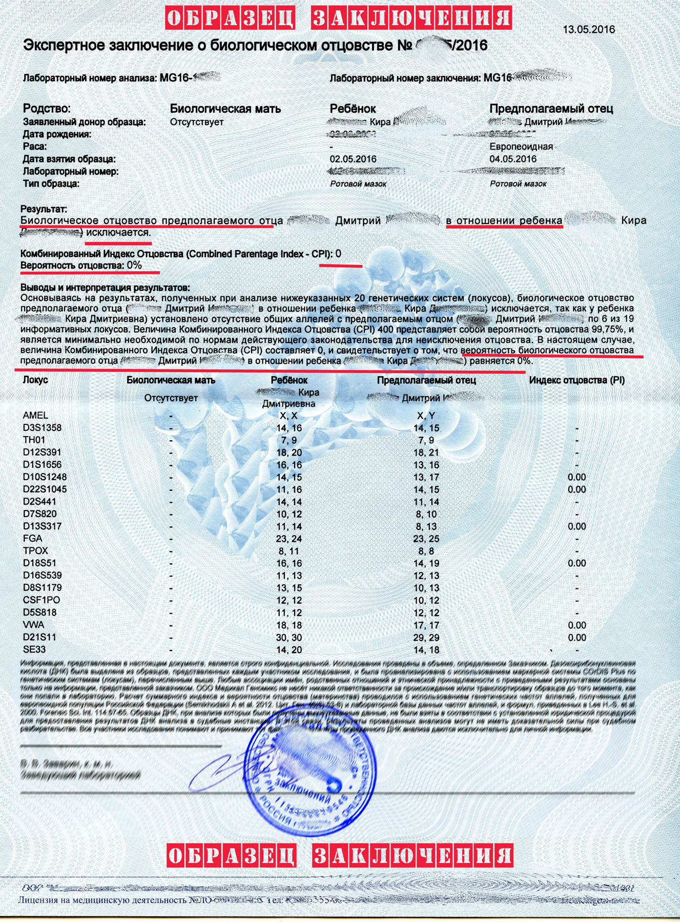 - для дуэта (ребенок - предполагаемый отец) в отсутствие другого родителя: не ниже 99,75% (рассчитываемый как Байесова вероятность отцовства/материнства).