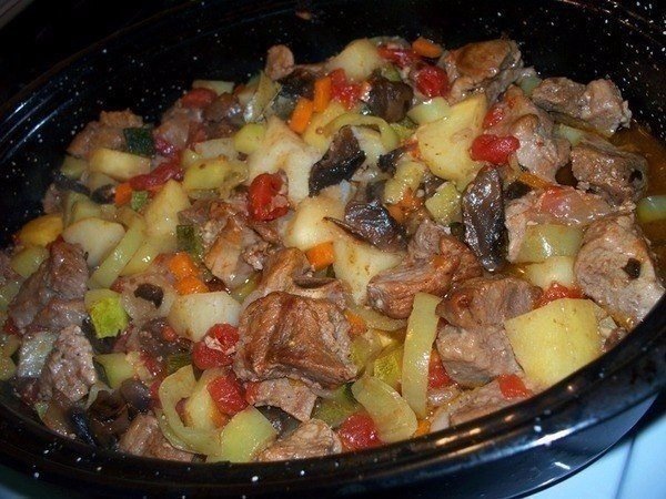 Обжарить мясо минут 20. Затем к мясу добавить грибы, лук,морковь, перец, закрыть крышку и тушить все вместе на «выпечке» еще 15 – 20 минут.