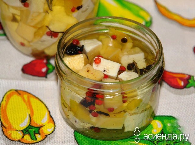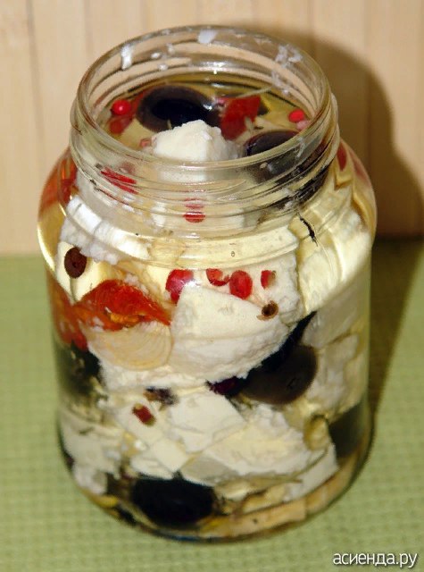 Маринады для таких сыров могут быть разными, вот вариант горячего маринада: подсолнечное масло - 1 стакан. Перец чили - 1 шт. лимон (сок и цедра) - 1 шт. перец горошком - 0,5 ч. л. разные травы - 0,5 ст. л. чеснок - 0,5 гол. маслины - по желанию.