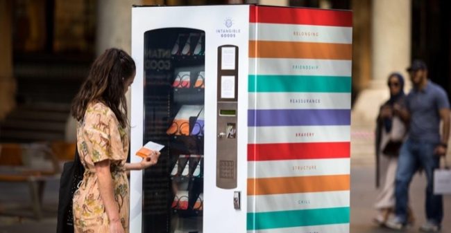 Нет, не своего настроения, а настроения покупателя. Вендинговая машина разработана и установлена как арт-объект в Сиднее. Человек подходит к ней и не может выбрать какой-то конкретный снэк или товар, ему предлагается выбрать, какое у него сейчас настроение. А потом забросить $1,50 (или оплатить картой) и получить пакетик неизвестно с чем. И вот там будет как раз то, что психологи посоветовали именно под это эмоциональное состояние. Это может быть что угодно. Письмо с советом, как найти друзей, карта с ближайшими музеями, даже лист бумаги с инструкцией, как сделать оригами. Всё очень умно и изящно. И людям нравится, потому что это прикольно и есть некий интерактив, плюс элемент неожиданности. В любом случае, за полтора доллара счастливы все!