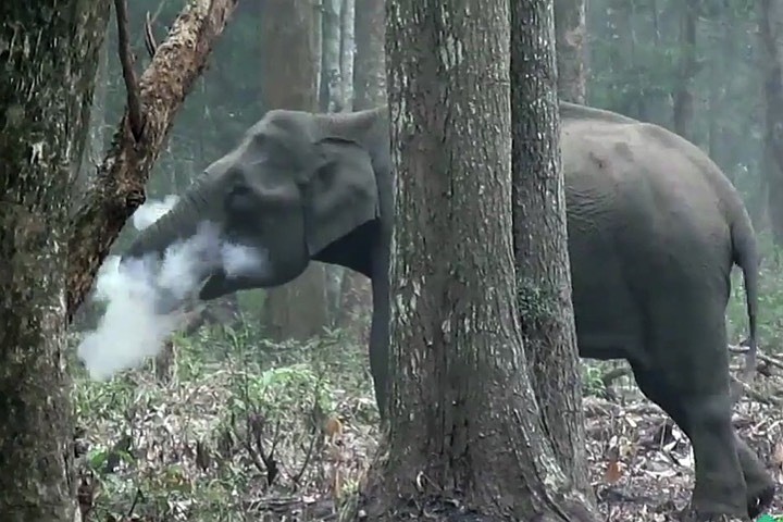 Занятное видео обнародовали служащие заповедника, один из которых - Винай Кумар (Mr Vinay Kumar) - является помощником директора индийского отделения Общества охраны дикой природы (Wildlife Conservation Society). На самом деле, слониха, конечно же, не курит — по крайней мере ни сигару, ни трубку, ни самокрутку она в хоботе не держит. Тогда откуда дым у нее из пасти? Клуб любознательных.
