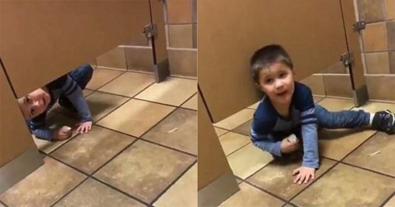 Сидевший на унитазе мужчина был очень удивлён, когда под дверь его кабинки заполз незнакомый ребёнок (1 фото + 1 видео)