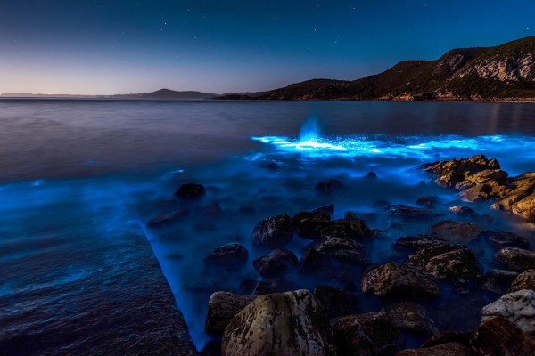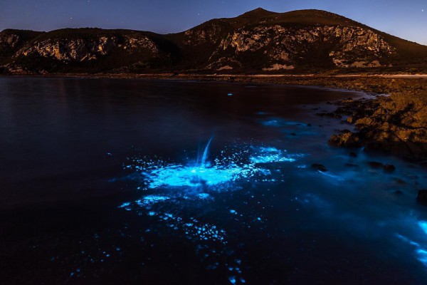 Вода в национальном парке Роки Кейп засияла неоновым светом из-за активности водорослей ночесветки.