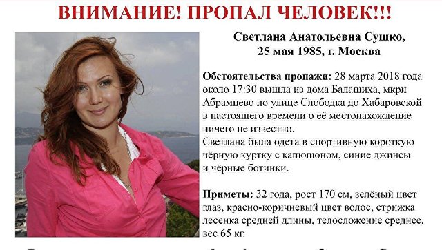 По её словам, 28 марта в Балашихе Светлана вышла из дома и не вернулась. Она не взяла с собой ни телефона, ни документов. Марина и родственники опасаются, что странное поведение женщины могло быть следствием "промывки мозгов" или даже вербовки: Светлане, по словам ее подруги, часто звонил какой-то человек, о котором женщина наотрез отказывалась рассказывать.