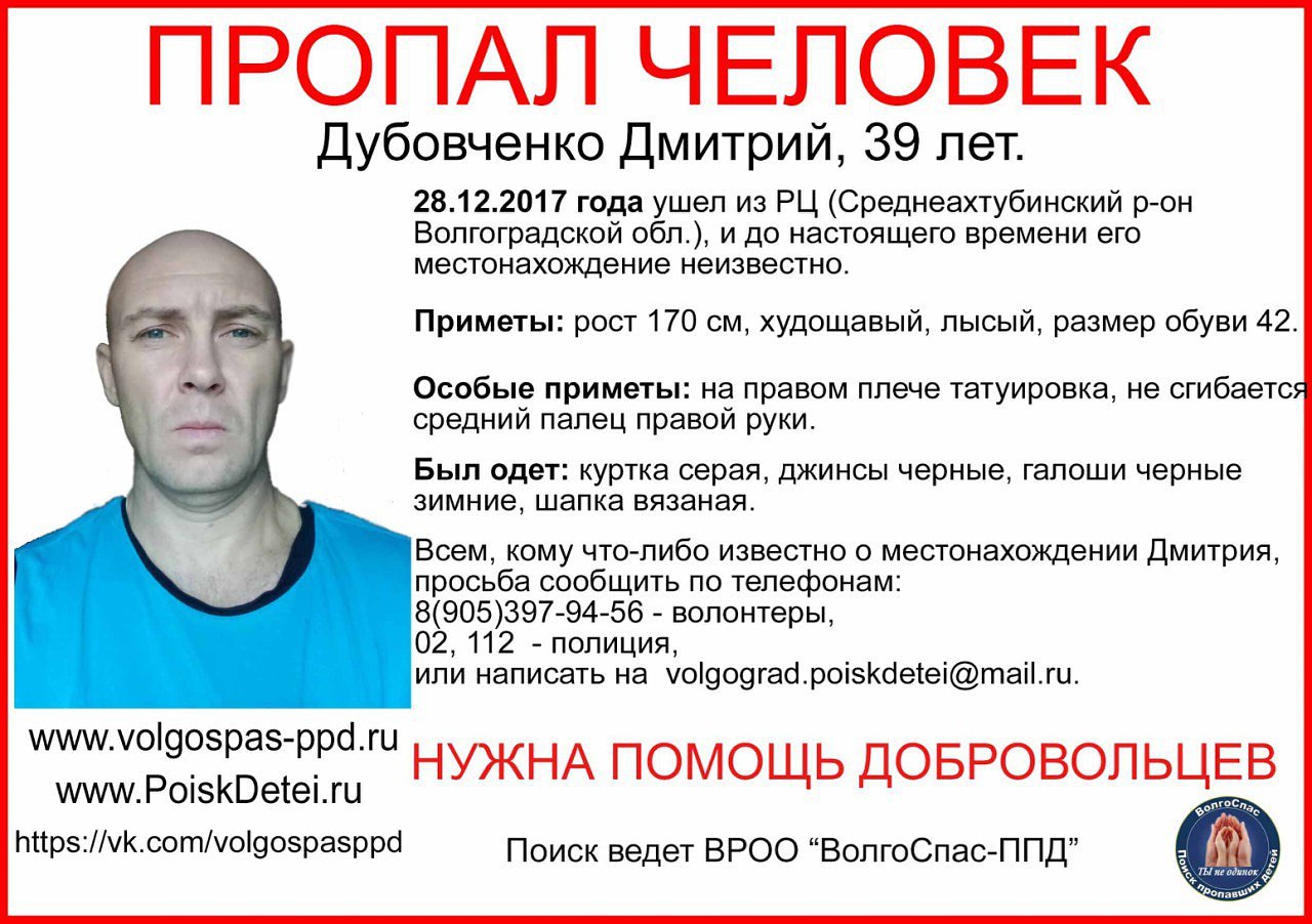 39-летний Дмитрий Дубовченко ушел из реабилитационного центра «Хорив», расположенного в поселке Средняя Ахтуба, 28 декабря 2017 года. До сих пор о его местонахождении ничего не известно.