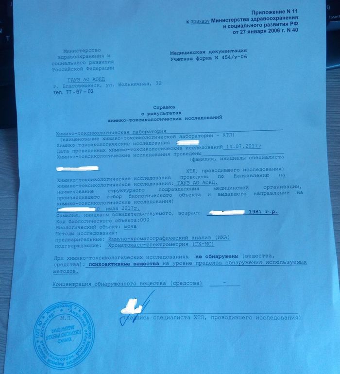 Звонит врачу. Та приходит, проводят еще один тест: все то же самое. Врач просит медсестру пломбировать стаканчик, отправлять в лабораторию, как пояснили, для более точного анализа. Меня тем временем приглашает в свой кабинет. Составляет акт. Спрашивает, что употреблял. И тут я понял, что в лучшем случае мне не дадут права. В худшем поставят на учет и возможно общение с полицией. Была мысль, что это развод и люди хотят денег. Но вслух свои предположения высказывать не стал.